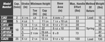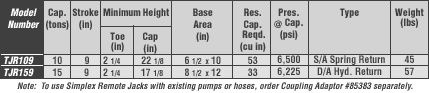 at 1" and capacities up to 25 tons, Simplex hydraulic toe jacks